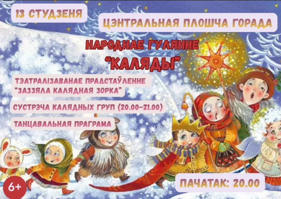 В программе: театрализованное представление «Заззяла Калядная зорка», встреча колядных групп (20.00-21.00), танцевальная программа.
