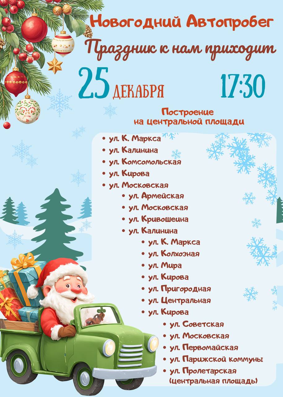Вечером по Старым Дорогам проедет новогодний автопробег! Колонна празднично украшенных машин стартует в 17.30 от городской площади.