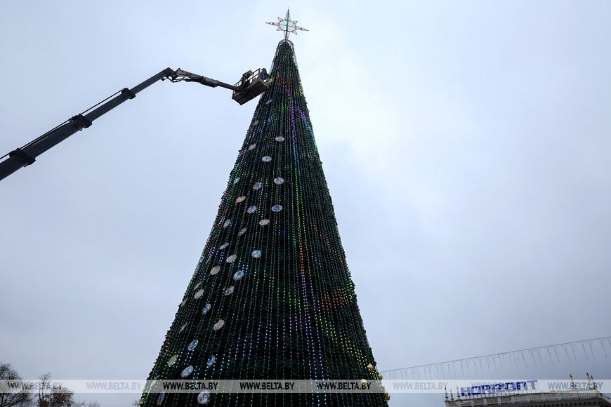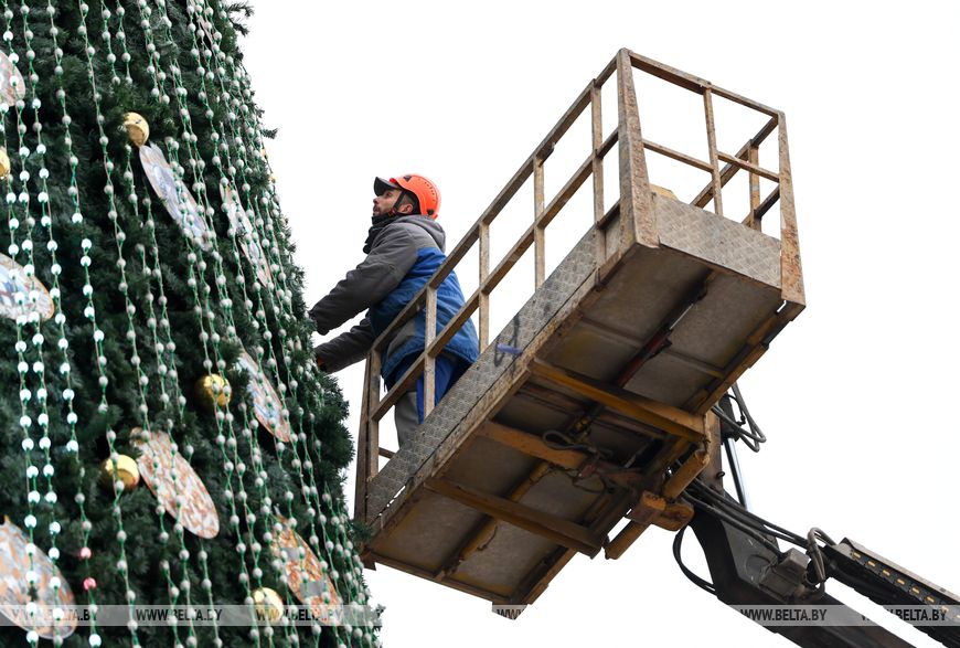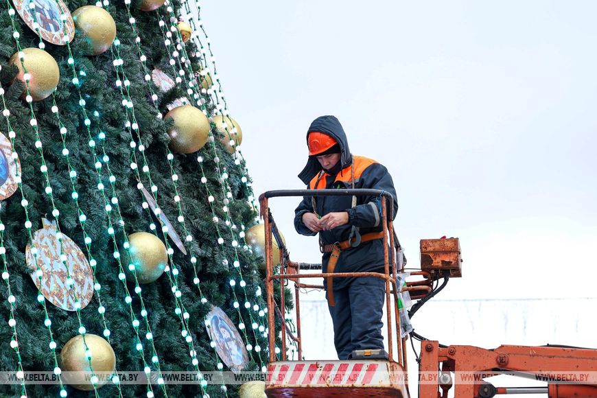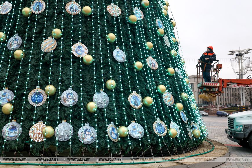 В Минске на Октябрьской площади украшают главную новогоднюю елку.