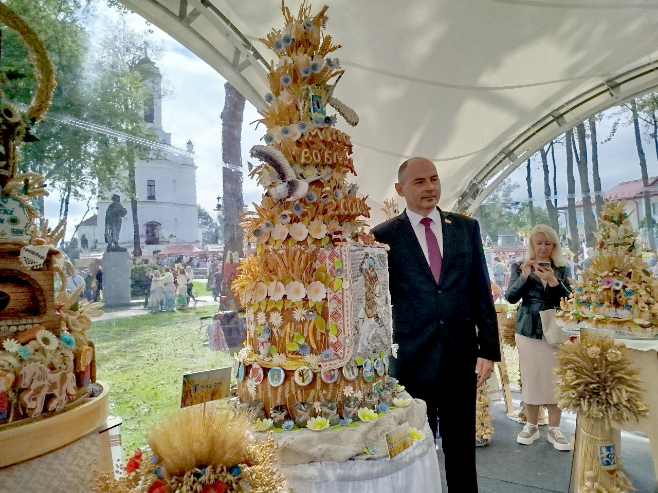 Главный каравай Минщины на «Дожинках» украсила икона, которую Президент Беларуси подарил председателю Минского областного исполнительного комитета. В павильоне караваев можно своими глазами увидеть этот шедевр кулинарии.