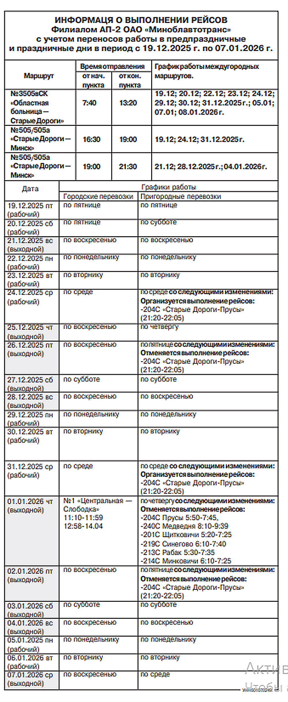 ИНФОРМАЦЯ О ВЫПОЛНЕНИИ РЕЙСОВ Филиалом АП-2 ОАО «Миноблавтотранс» с учетом переносов работы в предпраздничные и праздничные дни в период с 19.12.2025 г. по 07.01.2026 г.