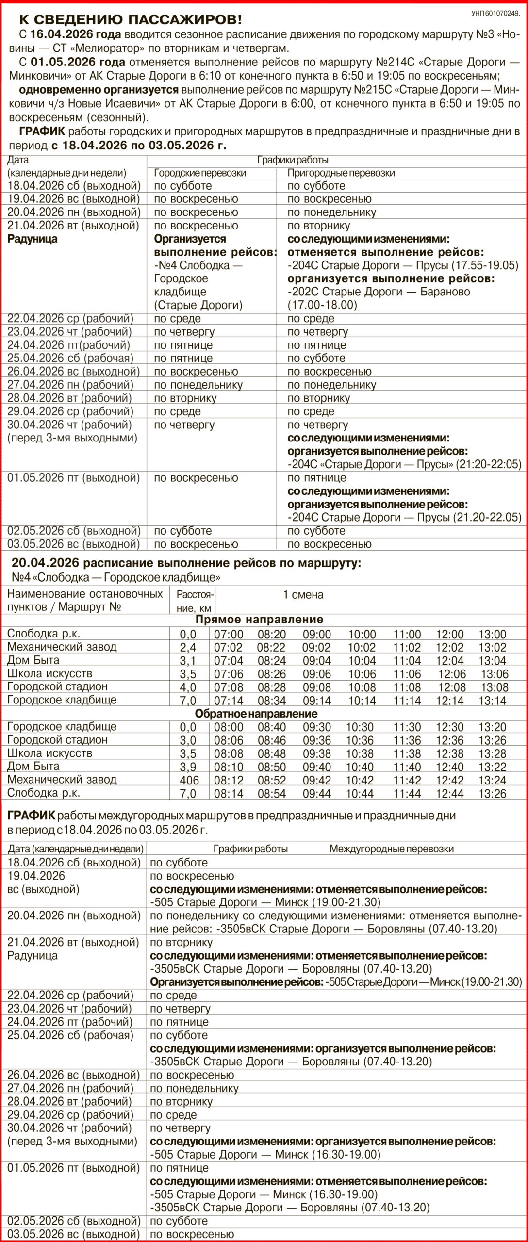 Домой общество Меняется расписание автобусов на Радуницу и майские праздники в Старых Дорогах и...обществоМеняется расписание автобусов на Радуницу и майские праздники в Старых Дорогах и по районуОт redactor - 13.04.20266110FacebookTwitterPinterestWhatsApp ЭТО МОЖЕТ БЫТЬ ИНТЕРЕСНОЕЩЕ ОТ АВТОРАВ Старых Дорогах обновили Аллею Памяти в честь воинов-афганцевВ 8-й бригаде РХБЗ чествовали увольняемых в запас военнослужащихВ Старых Дорогах проходит республиканская ярмарка вакансий для молодежи