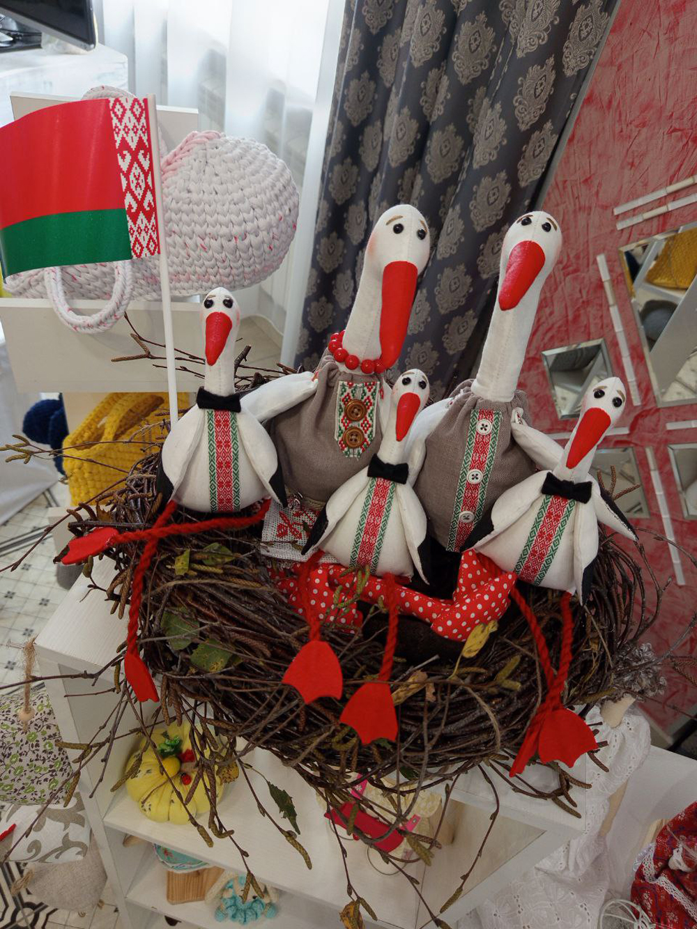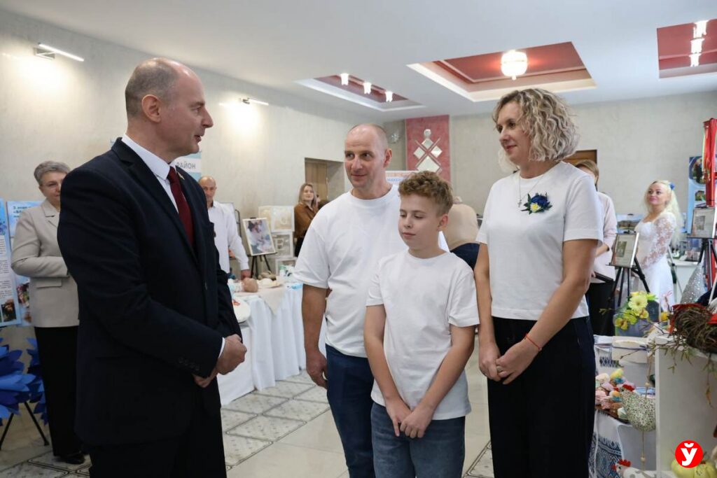 Алексею Кушнаренко понравилась презентация многодетной семьи Сащеко из Старых Дорог. Наталья и Александр воспитывают троих детей, и эту дружную семью мама представила в образе аистов — их она сделала своими руками.