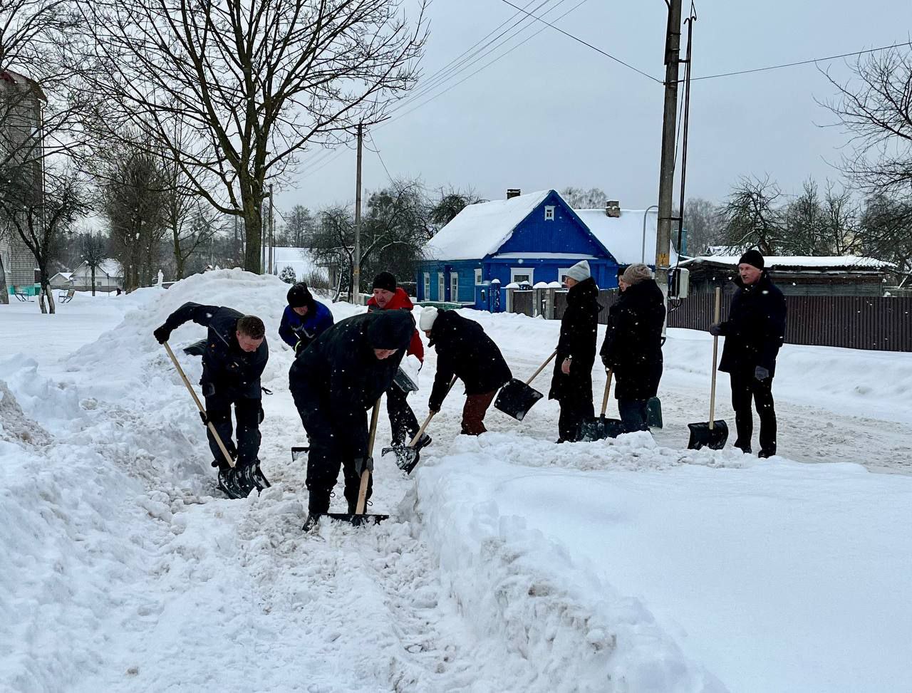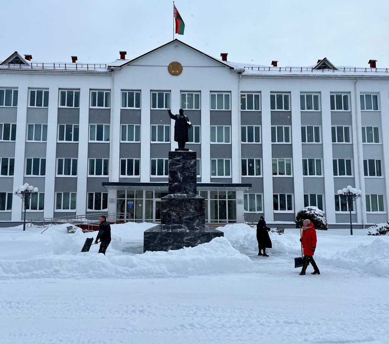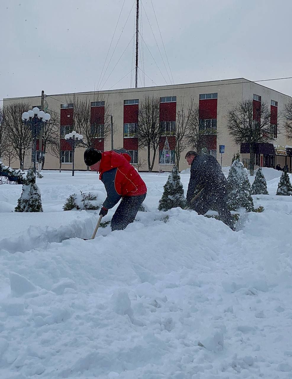 К масштабной уборке снега присоединились сотрудники районной администрации во главе с председателем райисполкома Дмитрием Сосиновичем и председателем районного Совета депутатов Дмитрием Давыдовым.